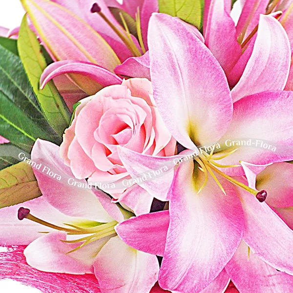 Стандартный (на фото): лилия розовая (возможна замена на белую) - 2 шт., роза розовая - 3 шт., натуральная упаковка - розовая.