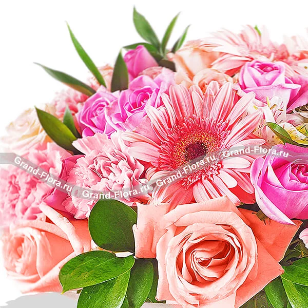 Стандартный: гербера розовая - 2 шт., роза аква - 3 шт., роза розовая - 4 шт., альстромерия розовая - 2 шт., гвоздика розовая - 4 шт., декоративная зелень, фетр розовый, бант розовый.